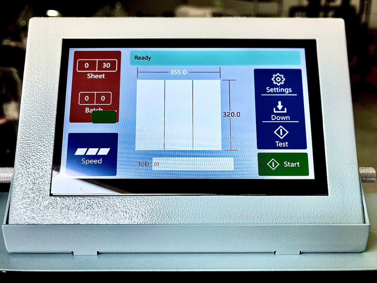 Máy sử dụng hệ thống điều khiển cảm ứng hiện đại, cho phép lập trình tự động vị trí đường cấn, thay đổi dao linh hoạt và tùy chỉnh độ sâu, độ nghiêng theo yêu cầu sản xuất.