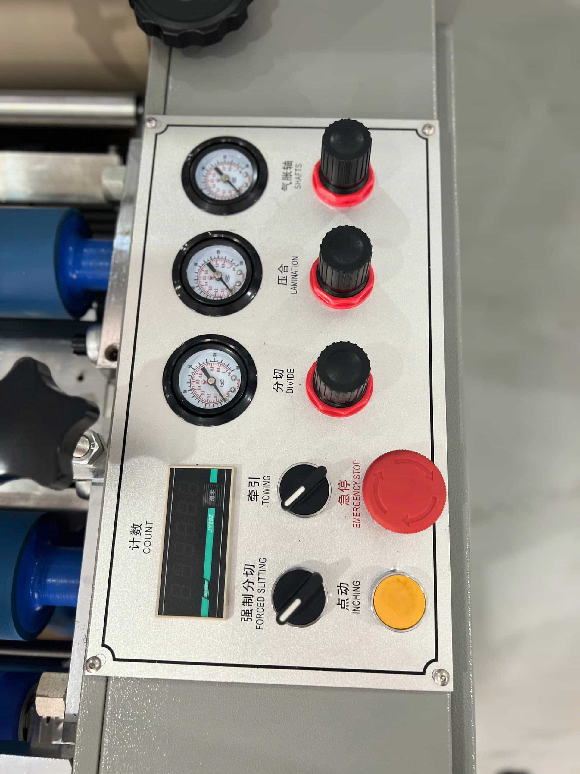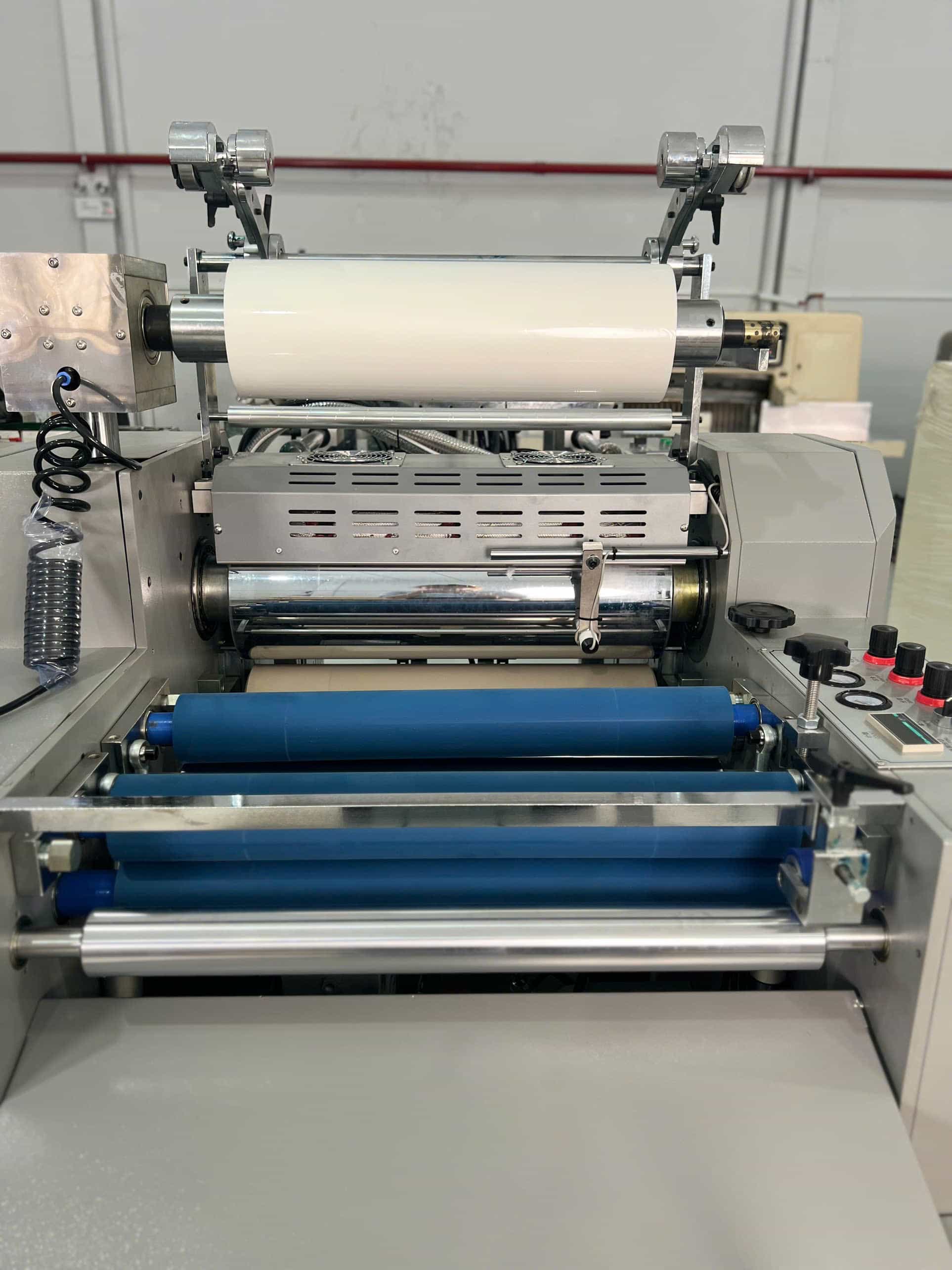 Ngoài ra, máy sử dụng hệ thống thủy lực áp lực cao kiểm soát lực ép chính xác, ép đều – ép mạnh – ép ổn định, có thiết bị tách màng bằng khí nén, hệ thống chống cong chuyên dụng, và tự động dừng máy khi thiếu giấy để tăng độ an toàn và bảo vệ thiết bị.