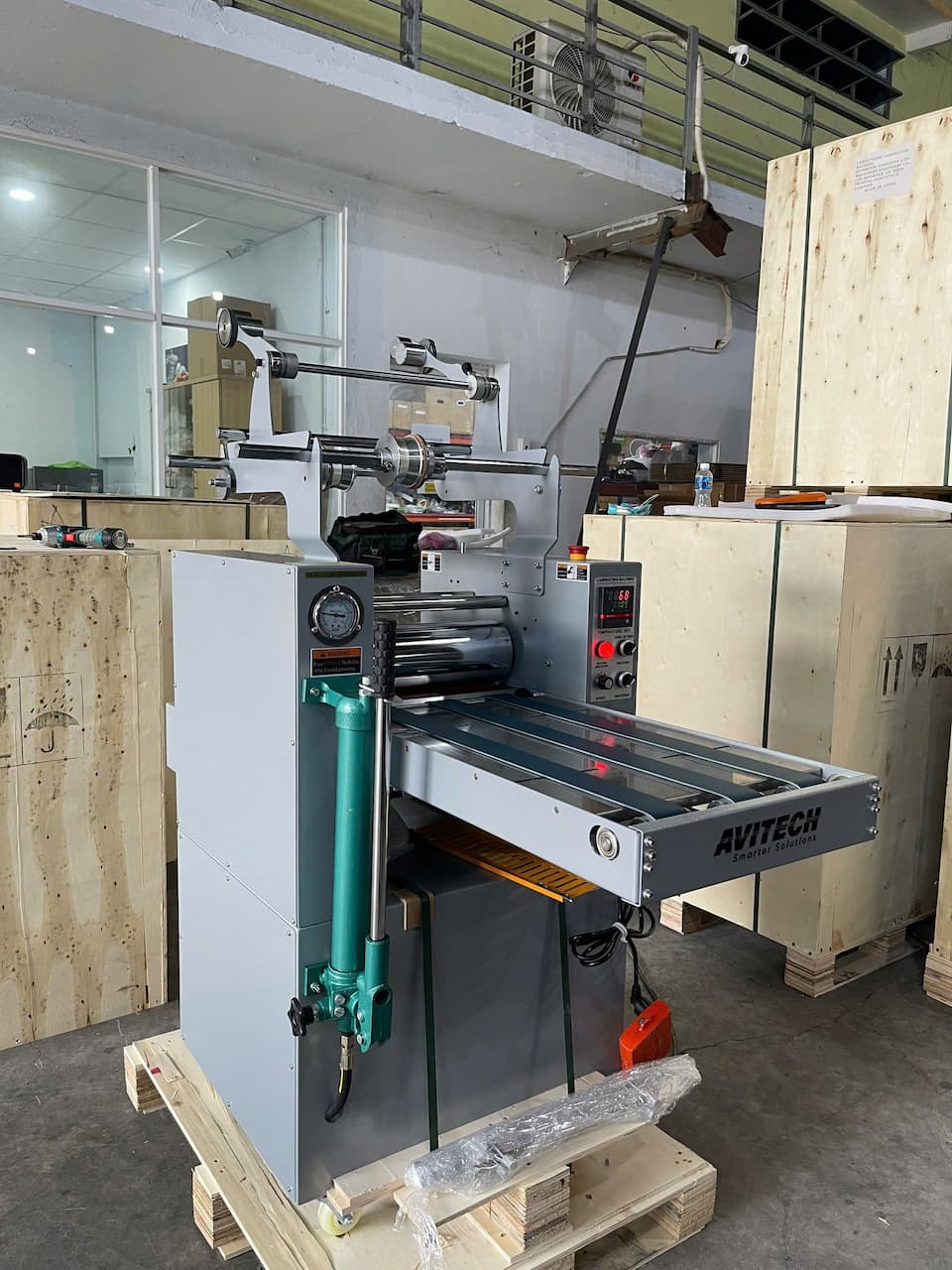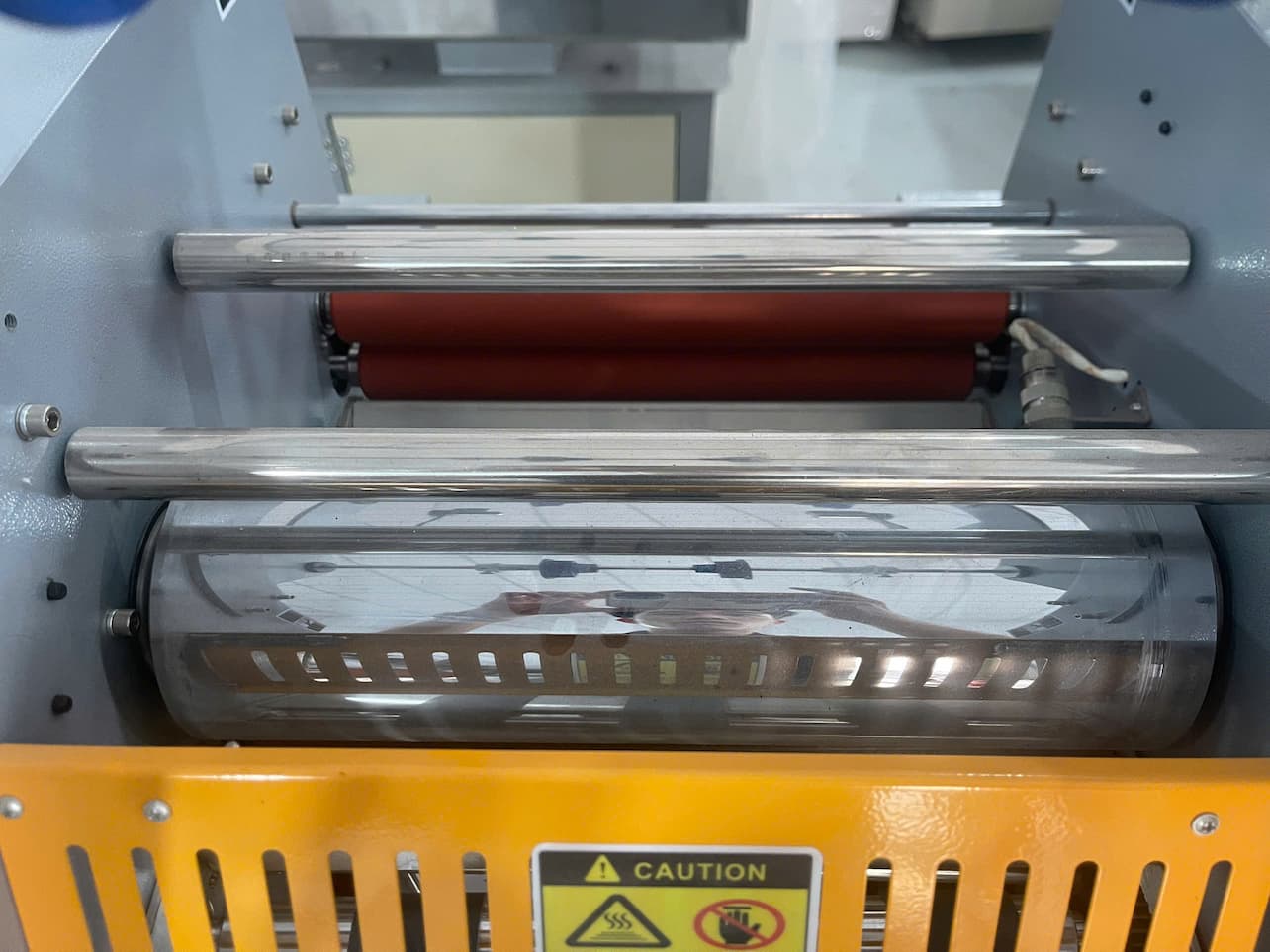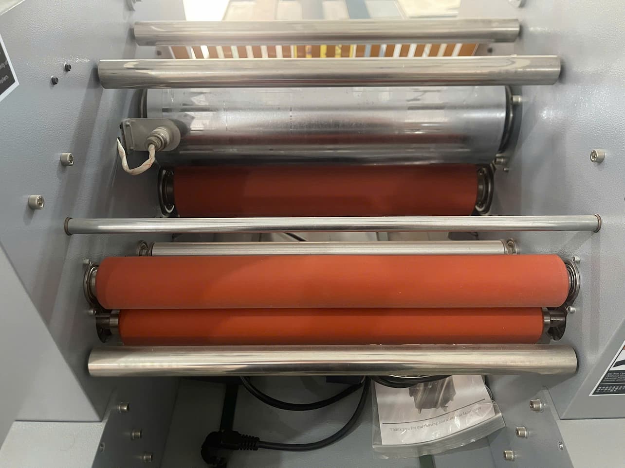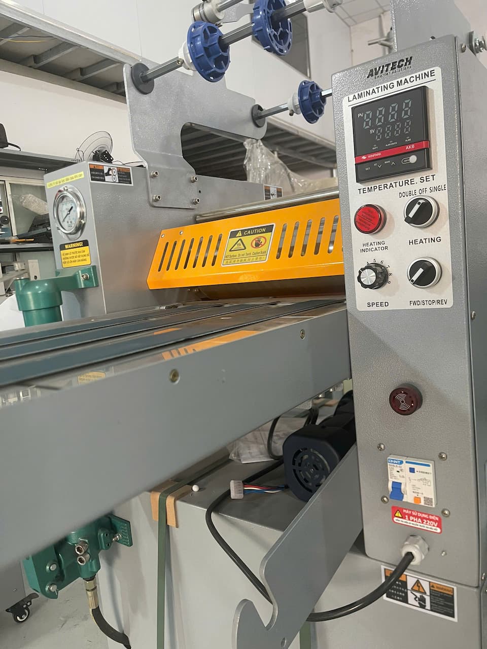 - - Cùng với phương pháp ép thủy lực ổn định, tuổi thọ máy cao, áp lực cán rất khỏe, lô cán của máy bằng inox cao cấp, đường kính lô to tiếp xúc với sản phẩm hoàn hảo, thành phẩm sắc nét nhất là với các màu nền đậm xanh, đen, đỏ,..