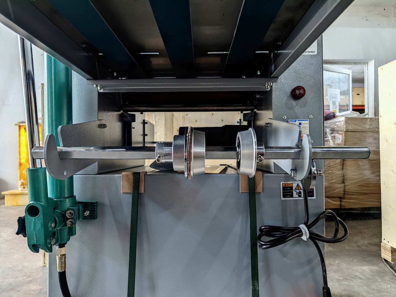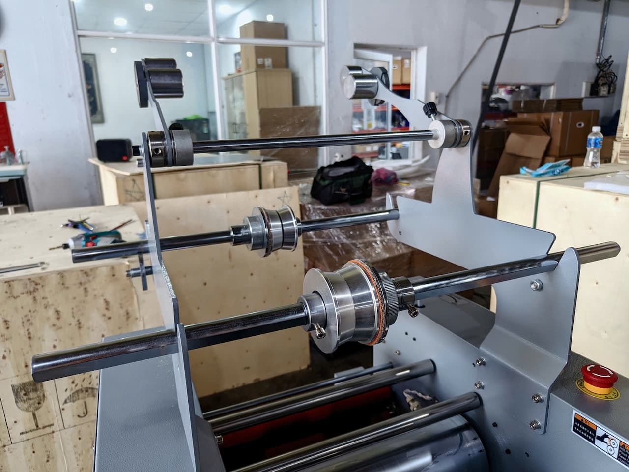 - - Máy có chức năng thu cuộn phía sau (dùng để cuộn lại những sản phẩm có định lượng giấy mỏng dễ bị cong sau khi cán (máy sẽ cuộn thành cuộn để nguội và khi xả sẽ không bị cong).